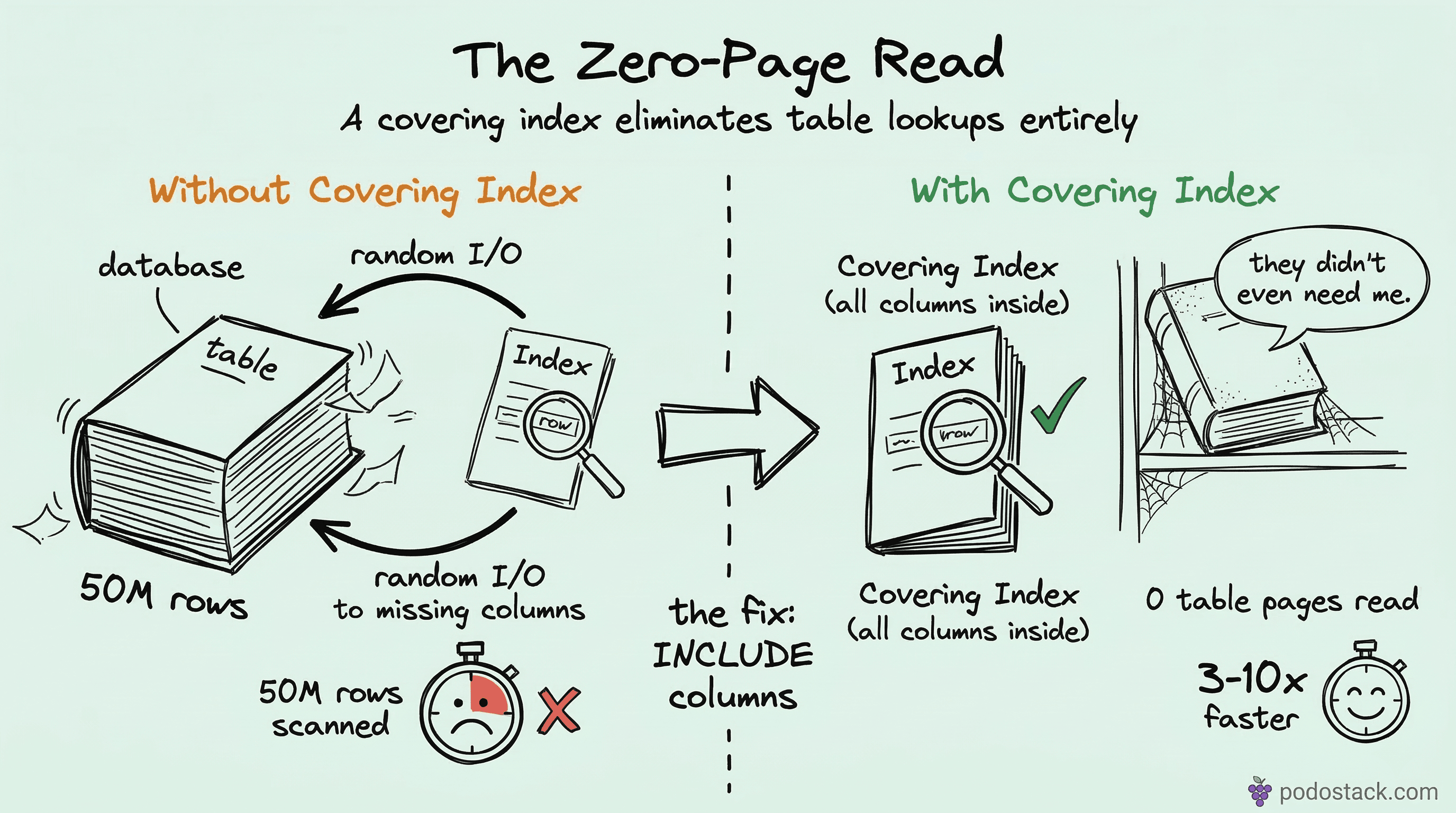 A covering index eliminates that second step. It contains all the columns the query needs, right there in the B-tree leaf pages. The database reads the index, gets everything it needs, and never touches the table.