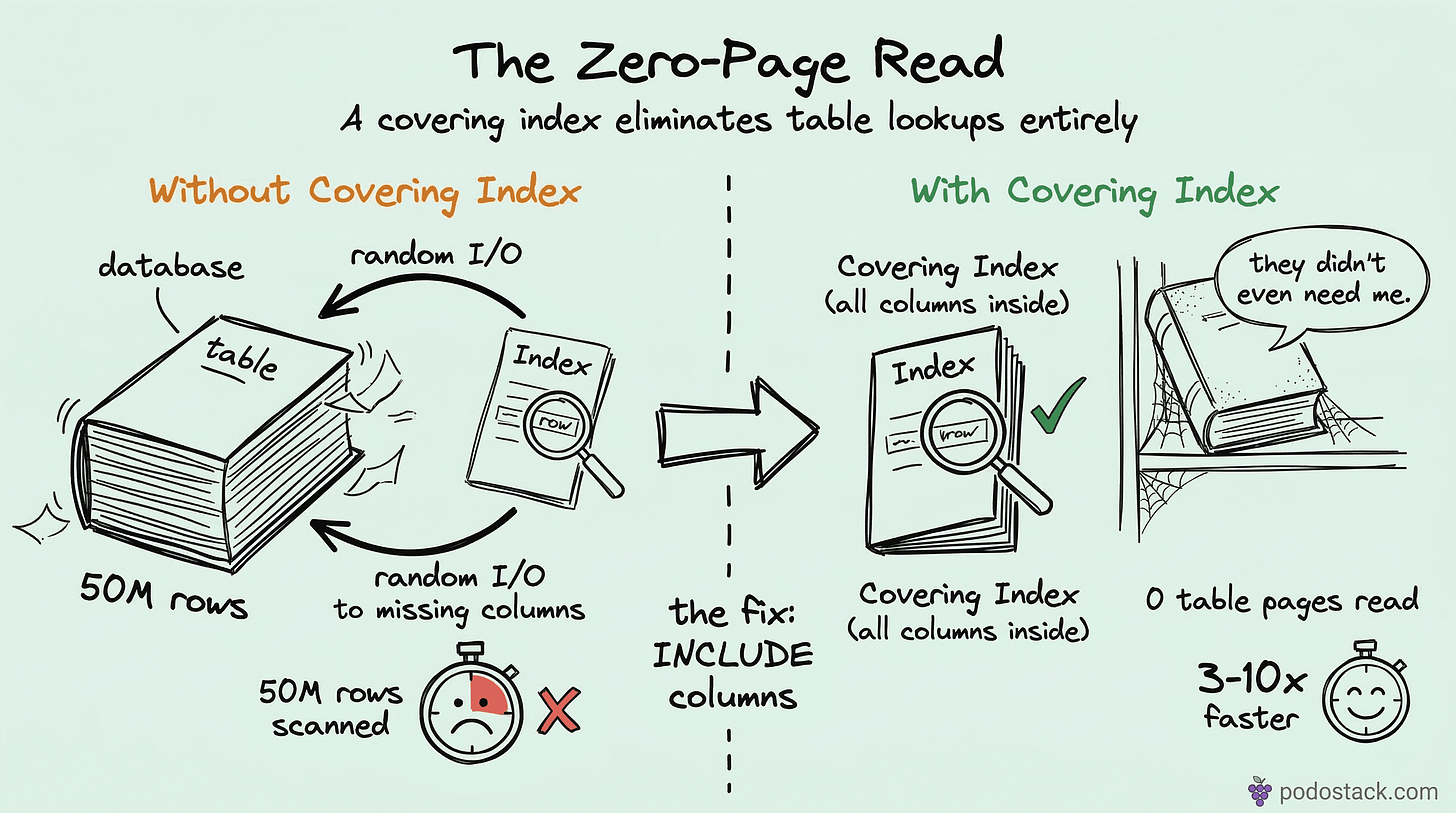 A covering index turns everything into sequential B-tree reads. The data sits together in the leaf pages, sorted by the index key. That’s where the 3-10x comes from - you’re replacing hundreds of random hops with a single range scan through contiguous index pages.