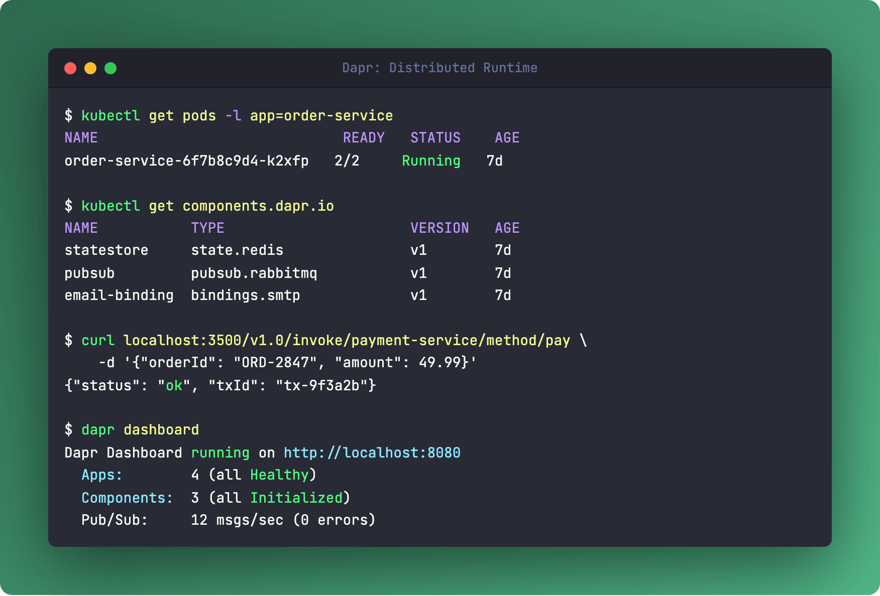 Dapr (Distributed Application Runtime) runs as a sidecar next to your app and exposes all those patterns through simple HTTP/gRPC APIs. Need to save state? POST /v1.0/state/mystore. Publish an event? POST /v1.0/publish/mytopic. Invoke another service? POST /v1.0/invoke/service-b/method/checkout.