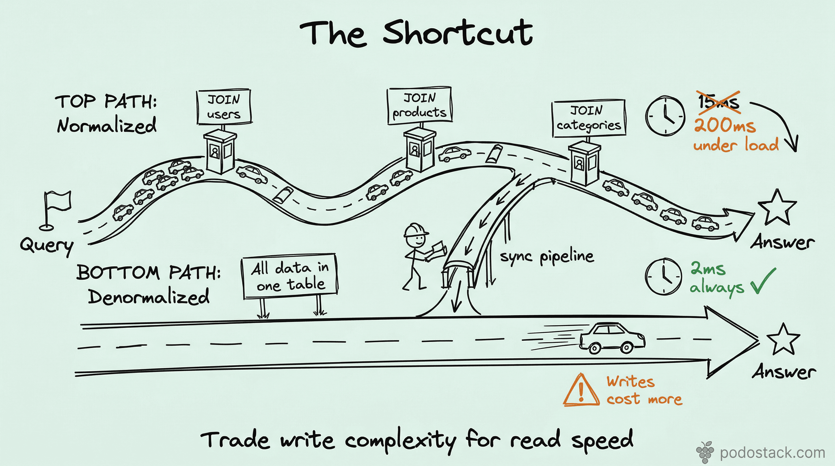 The JOIN is in the hot path. Not every slow query matters. Denormalize the queries that users wait on - page loads, API responses, search results. If it’s a nightly batch job, the JOIN is fine.