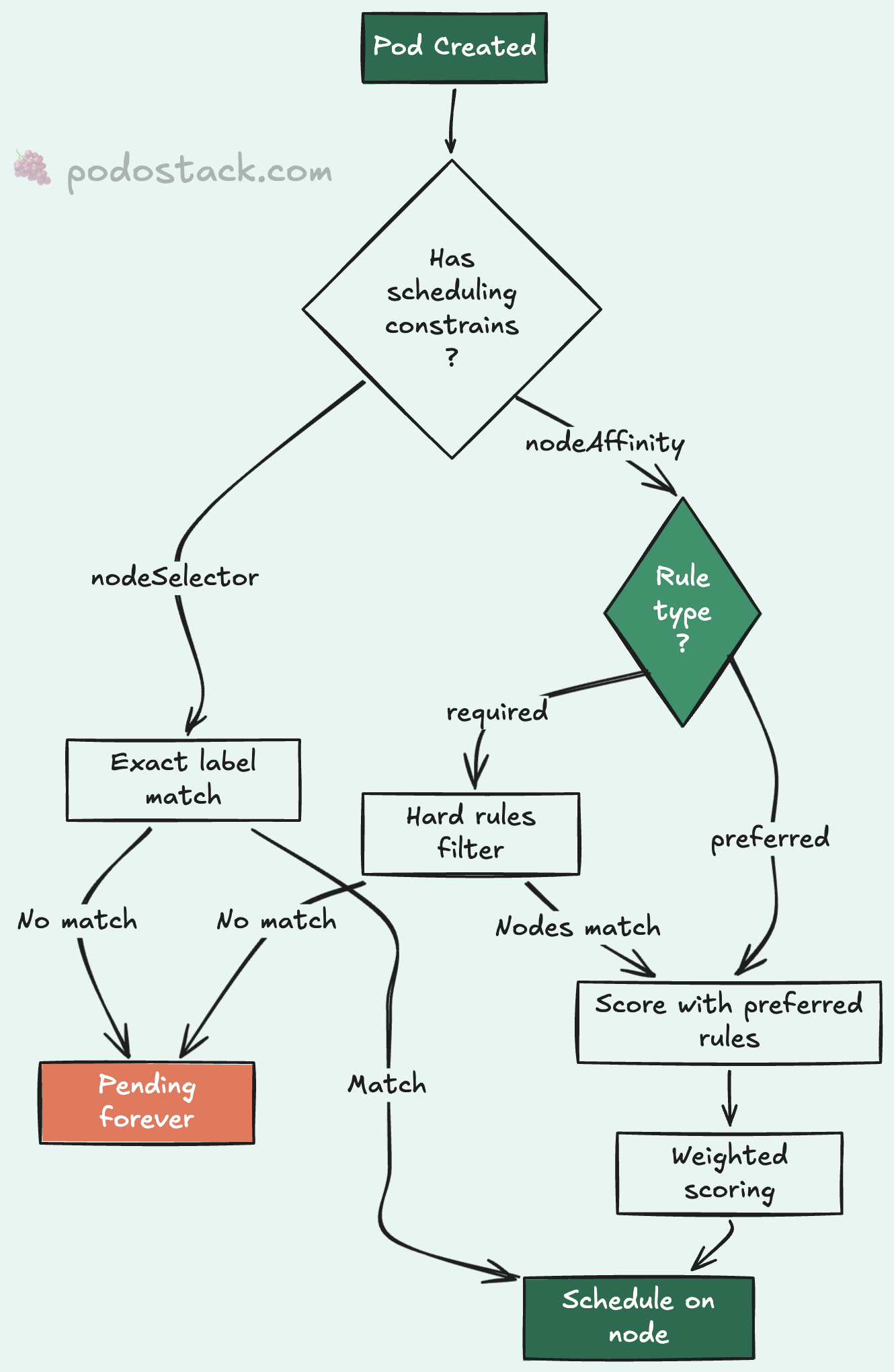 The name is a mouthful, but the idea is simple: hard rules. The pod won’t schedule unless the node matches. It’s nodeSelector with superpowers.
