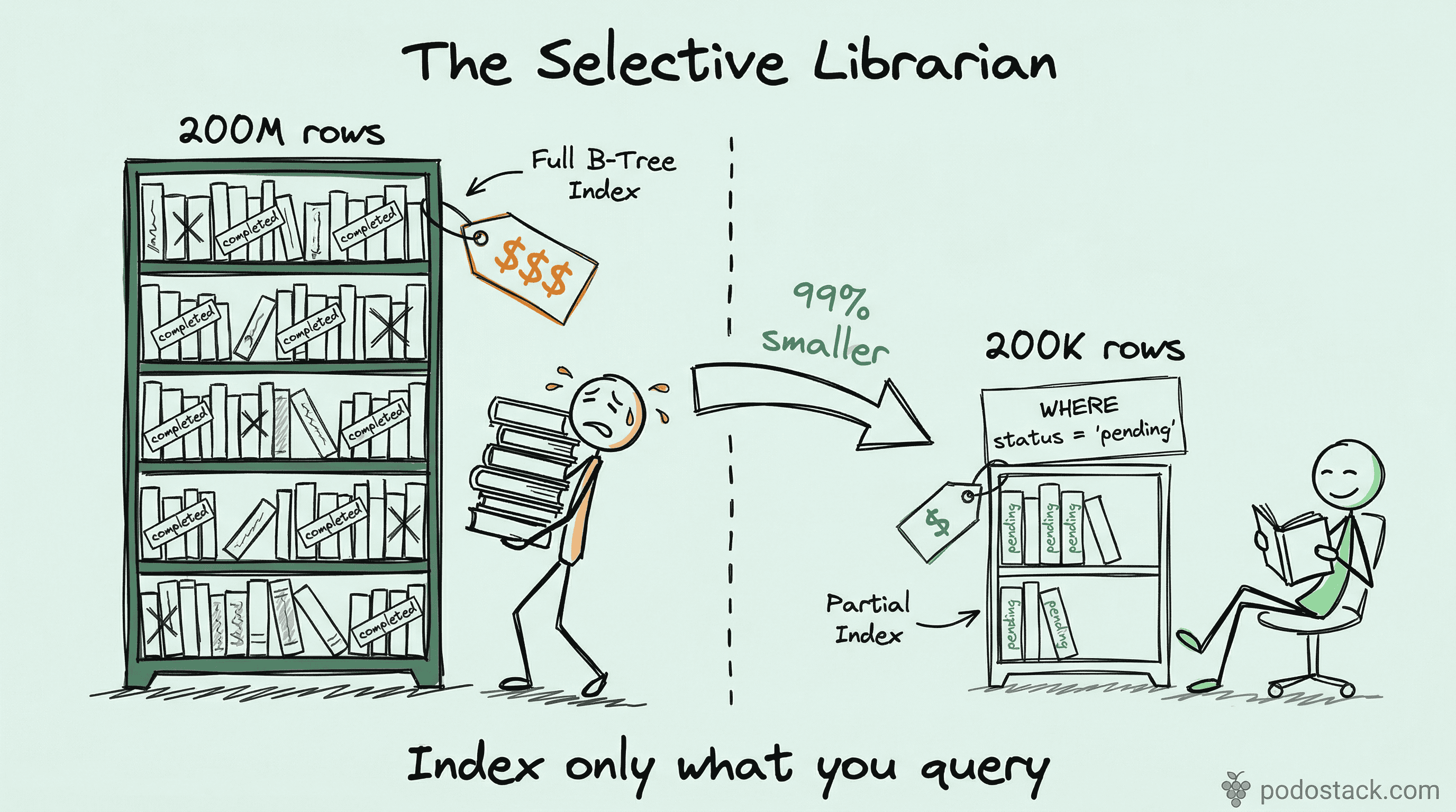PostgreSQL has this nice trick - CREATE INDEX ... WHERE status = 'pending'. The index only stores rows that match the condition. If you have 50 million orders and only 200,000 are pending, your index is tiny. Scans are fast. Disk usage is minimal.