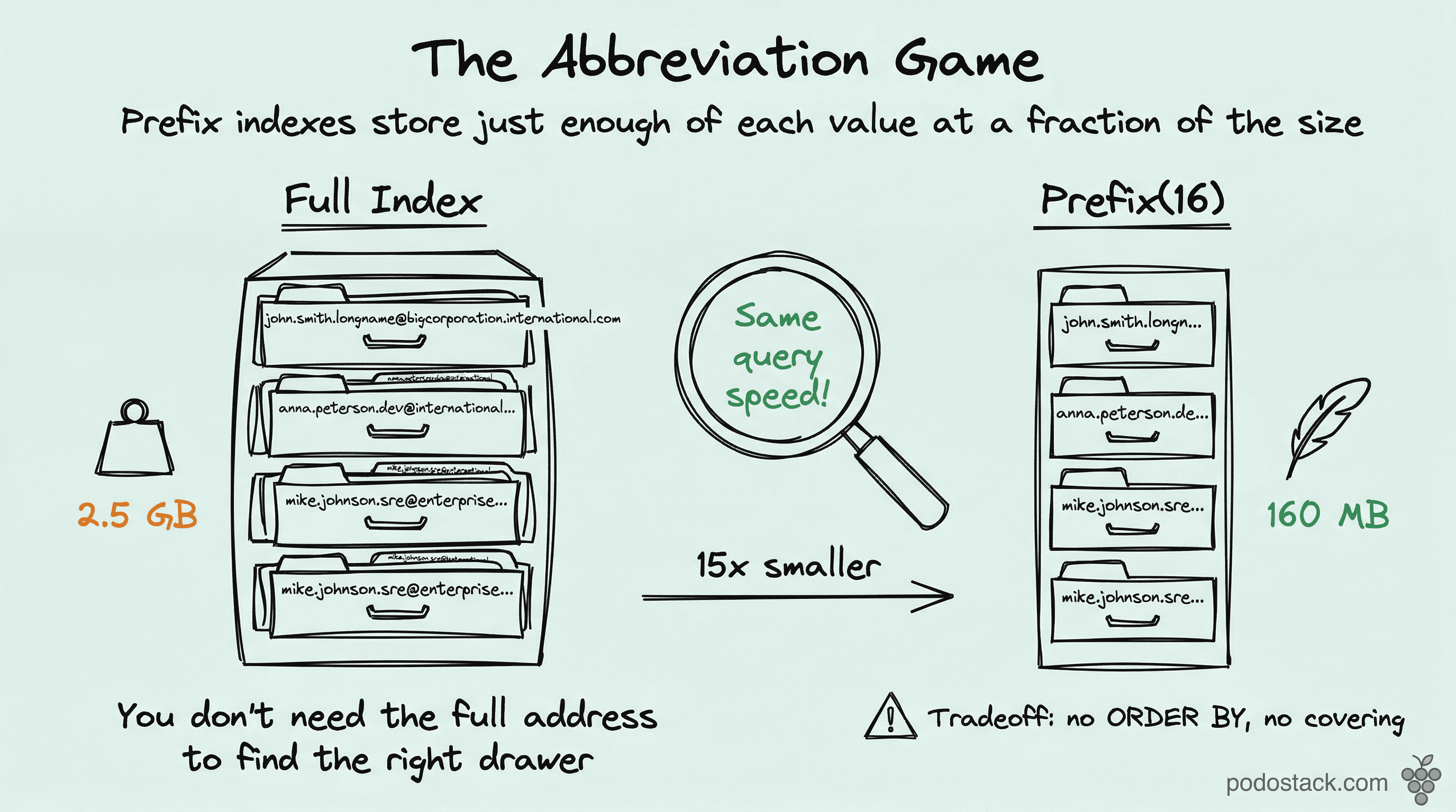 No ORDER BY optimization. MySQL can’t use a prefix index for sorting. ORDER BY email won’t benefit from email(16) - the optimizer doesn’t know the full order. If you need sorted results, you need the full-column index.