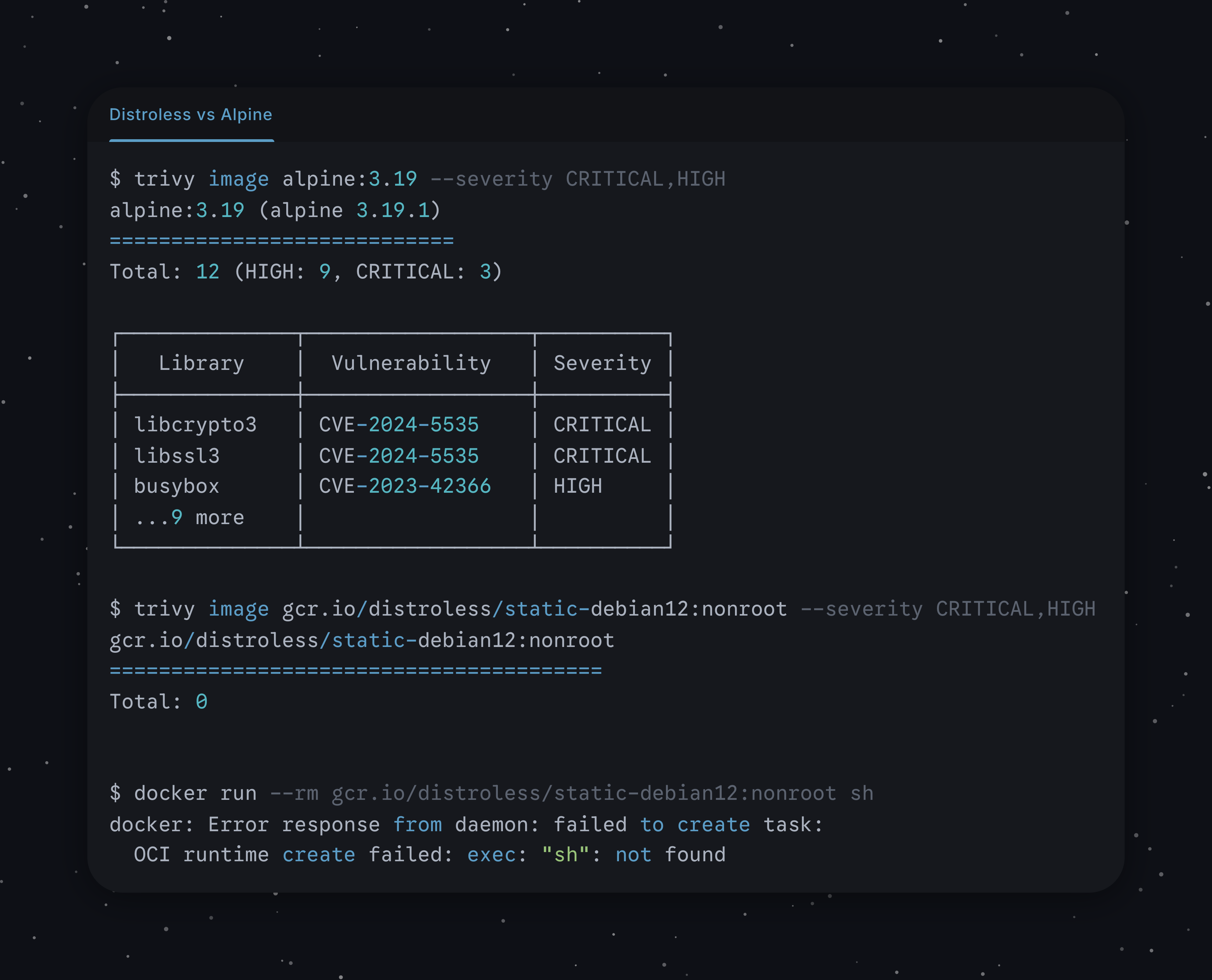 No package manager. No shell. No ls, no cat, no nothing. Just your binary and the runtime it needs. Google maintains the base images. Result: about 5 CVEs per year. There’s almost nothing to exploit because there’s almost nothing there.