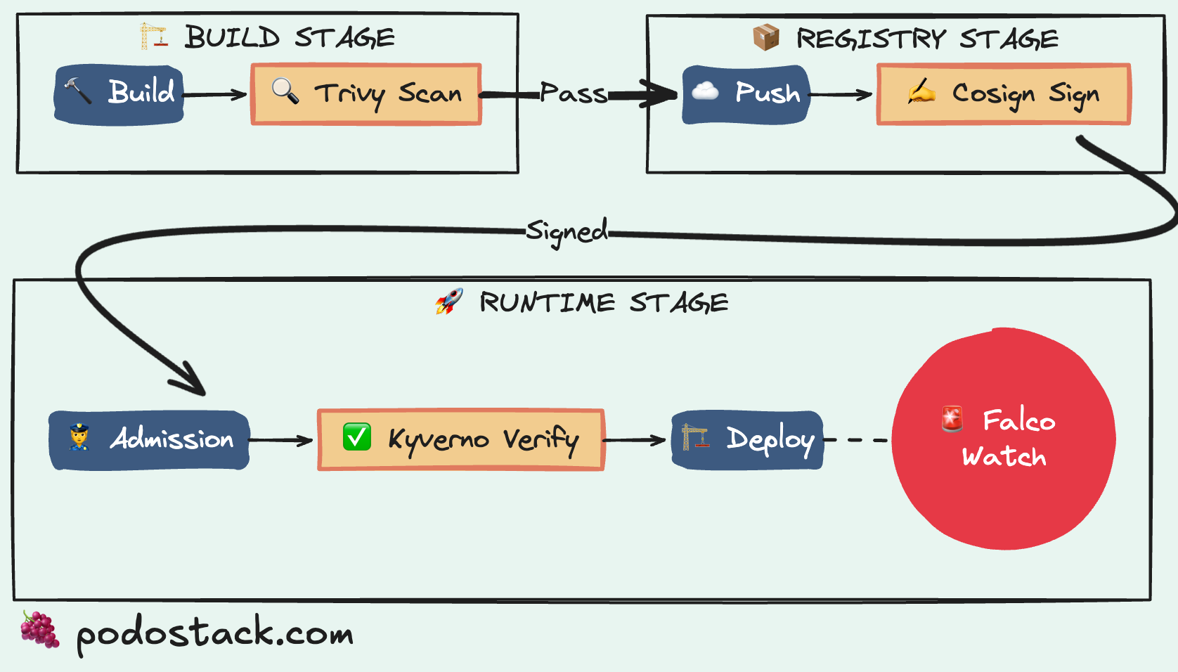 Layer 3: Admission — verify at the gate. Kyverno’s verifyImages rule checks that every image entering your cluster has a valid signature. No signature? Rejected. This is the last line of defense, and it’s the one we’ll build today in the Policy section below.