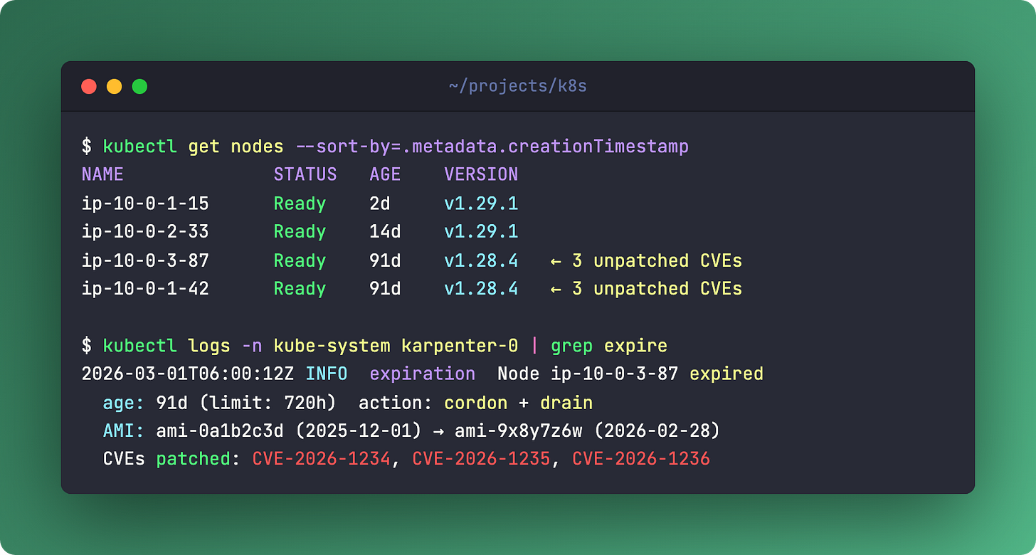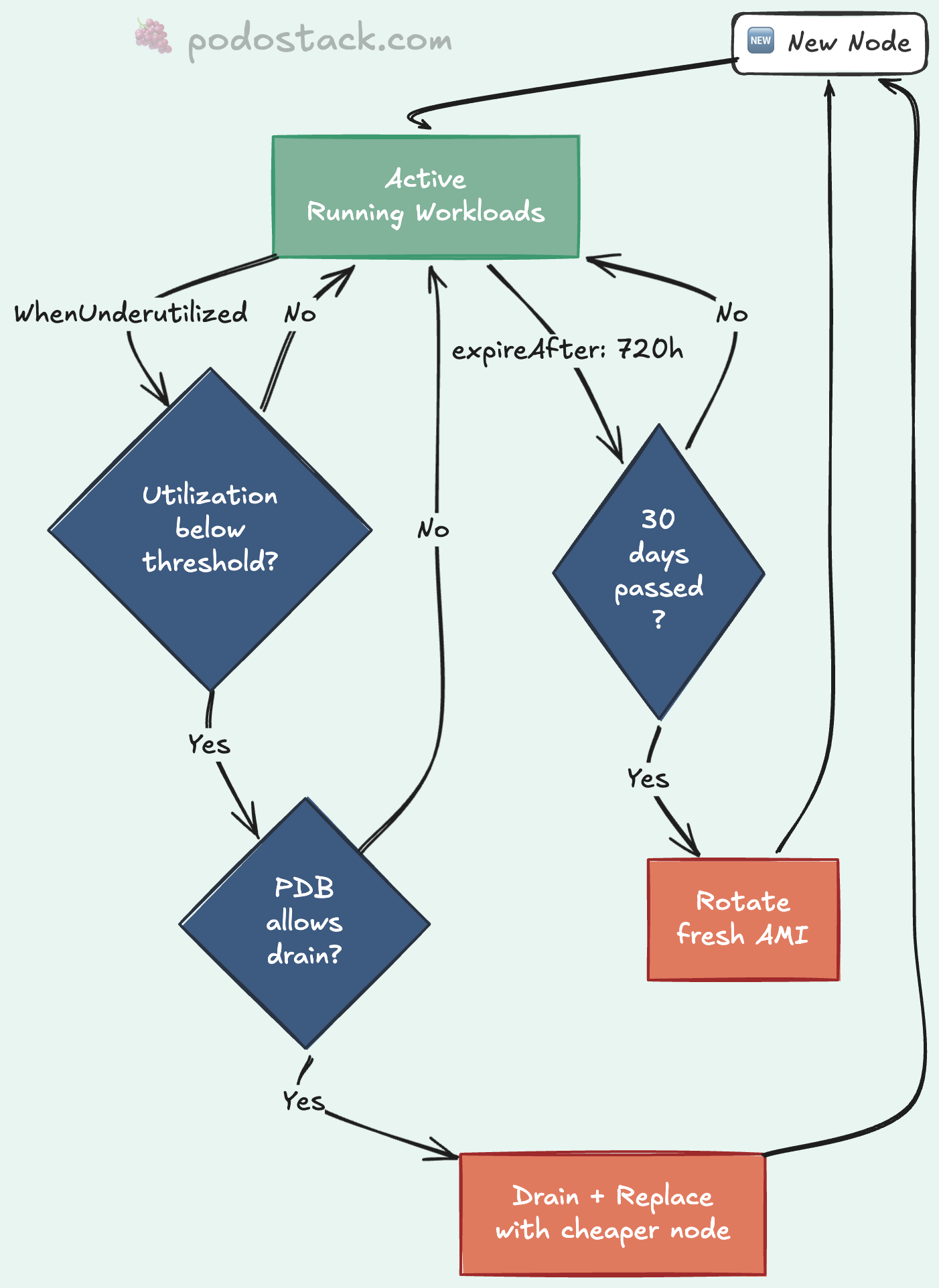 Then there’s expireAfter. Set it to 720h and every node gets replaced after 30 days. Why? Fresh AMIs with the latest patches. No more “this node hasn’t been updated since April.” It’s automated node rotation. Your security team stops filing tickets.
