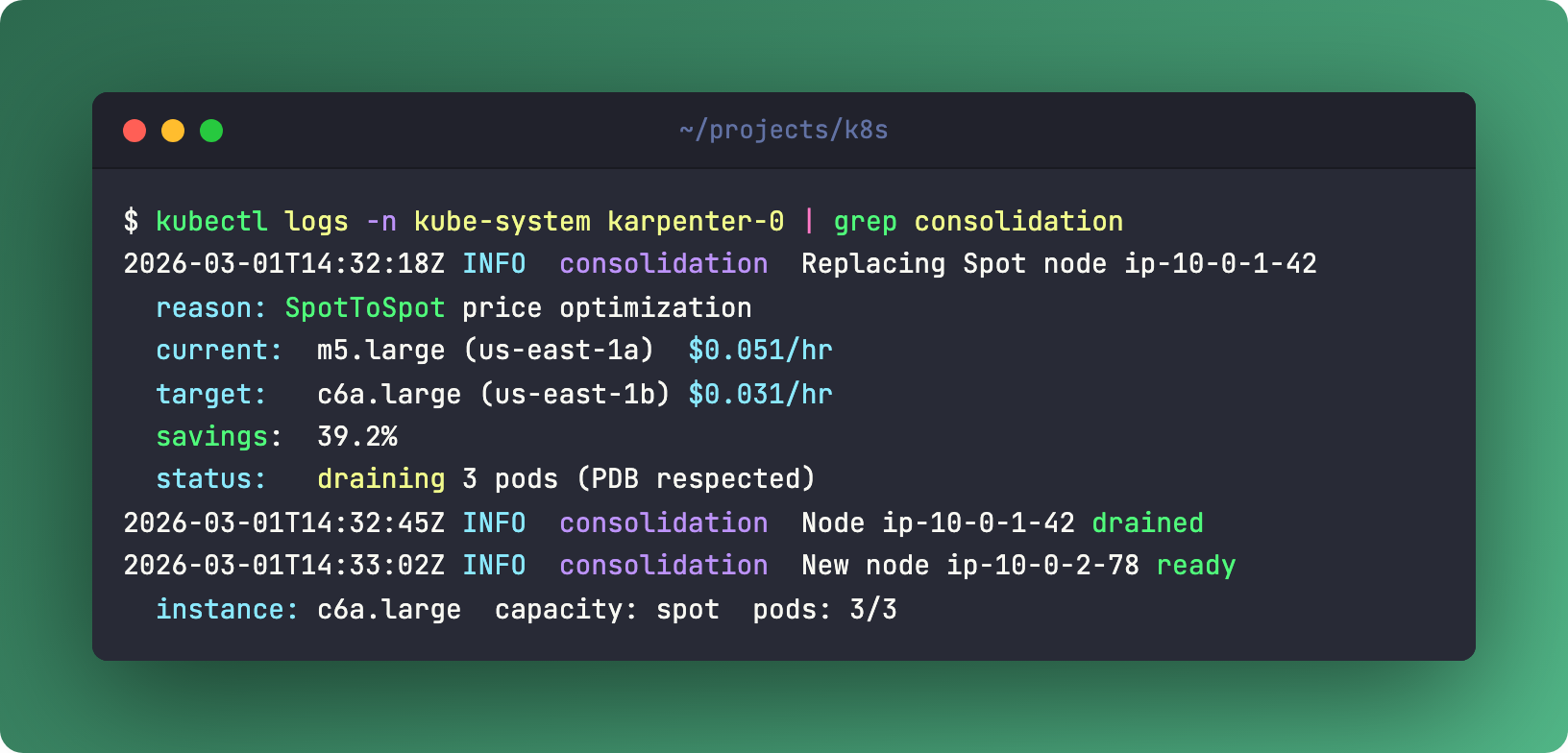 The trade-off is honest: more churn. Nodes get replaced more often. Your workloads need proper PodDisruptionBudgets. Without PDBs, Karpenter won’t drain - it checks every time. But if your services already handle rolling restarts gracefully, this is free money.