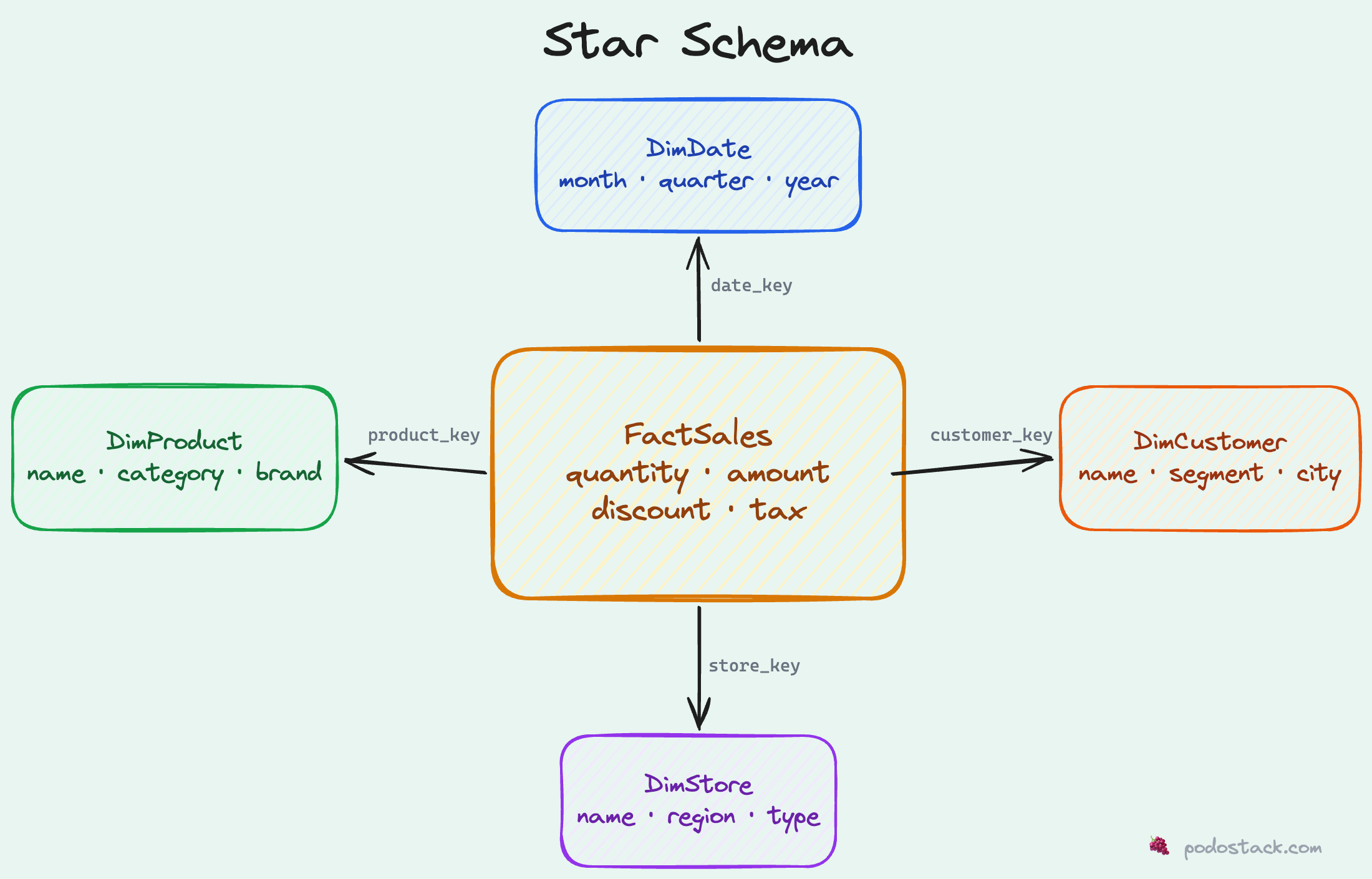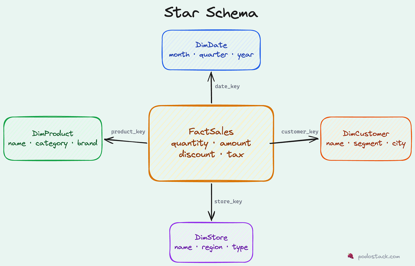 The fact table sits in the middle with foreign keys pointing to each dimension. That’s it. That’s the whole pattern. It looks like a star when you draw it, which is where the name comes from.